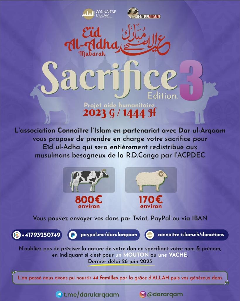 📣🎉 Grande nouvelle ! Pour la 3ème année consécutive, l'association "Connaître l'Islam" est ravie de collaborer avec "Dar al Arqam" pour vous présenter une initiative spéciale pour l'Aïd Al-Adha !🕌🎈